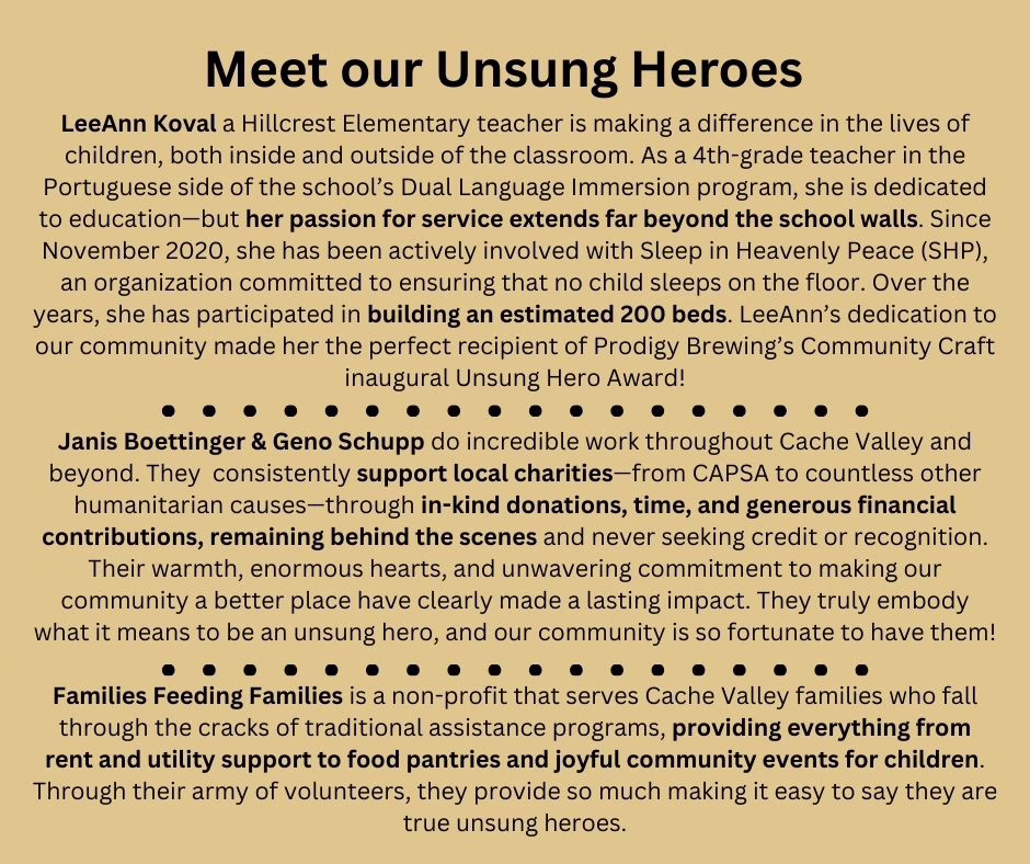 Community Craft is a 501(c)(3) non-profit organization founded by Prodigy Brewing with a mission close to our hearts: to honor and support the unsung heroes of Cache who are making our community stronger.